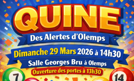 Venez nombreux participer au quine annuel de l’association des Alertes d’Olemps le dimanche 29 mars 14h30 à la salle Georges Bru. Cartons : 5 euros l’un 15 euros les 4 20 euros les 6 Nombreux lots à gagner