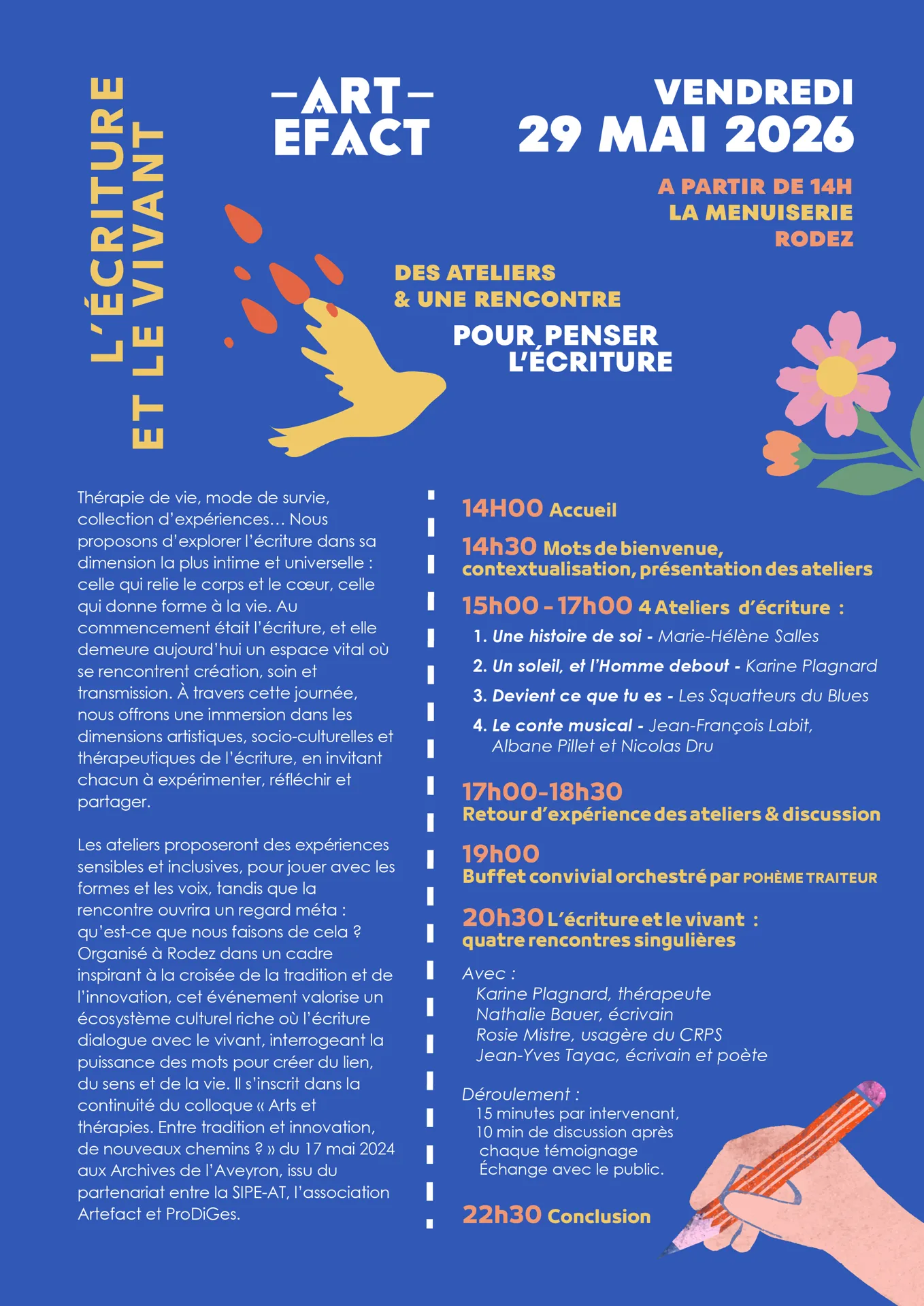 L’association Artefact et ses partenaires propose un moment de partage autour des diverses formes que peut prendre l’écriture. Les ateliers de l’après-midi offriront un espace où l’écriture est accessible à tous. Un moyen d’explorer son monde intérieur, son imaginaire et ses souvenirs, ce qui vient Ici et Maintenant, ce qui circule, ce qui se transforme, ce qui se partage et vient nourrir le vivant.