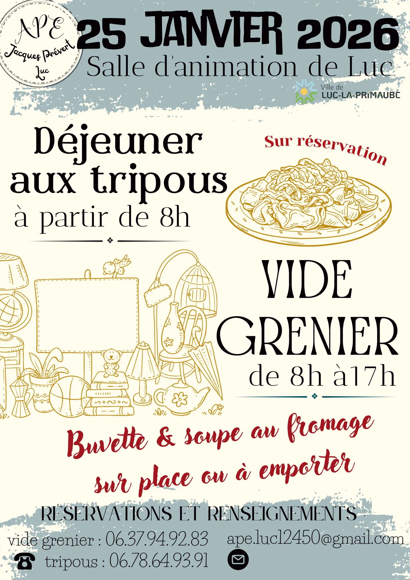 Vide grenier et déjeuner aux tripous organisés par l’APE de l’école Jacques Prévert à Luc.