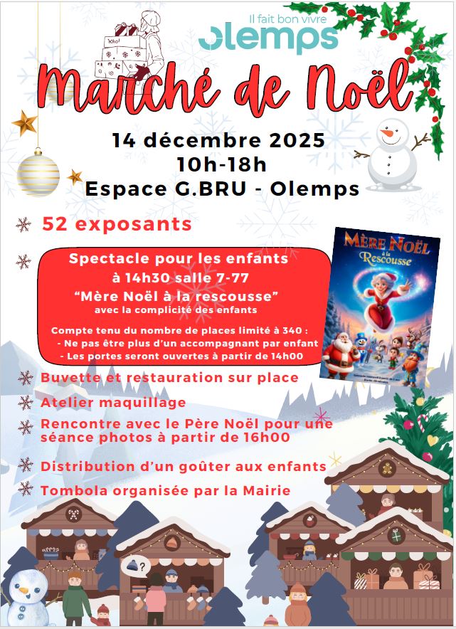 Le marché de Noël d’Olemps se déroulera le dimanche 14 décembre à l’espace Georges Bru, de 10h00 à 18h00.