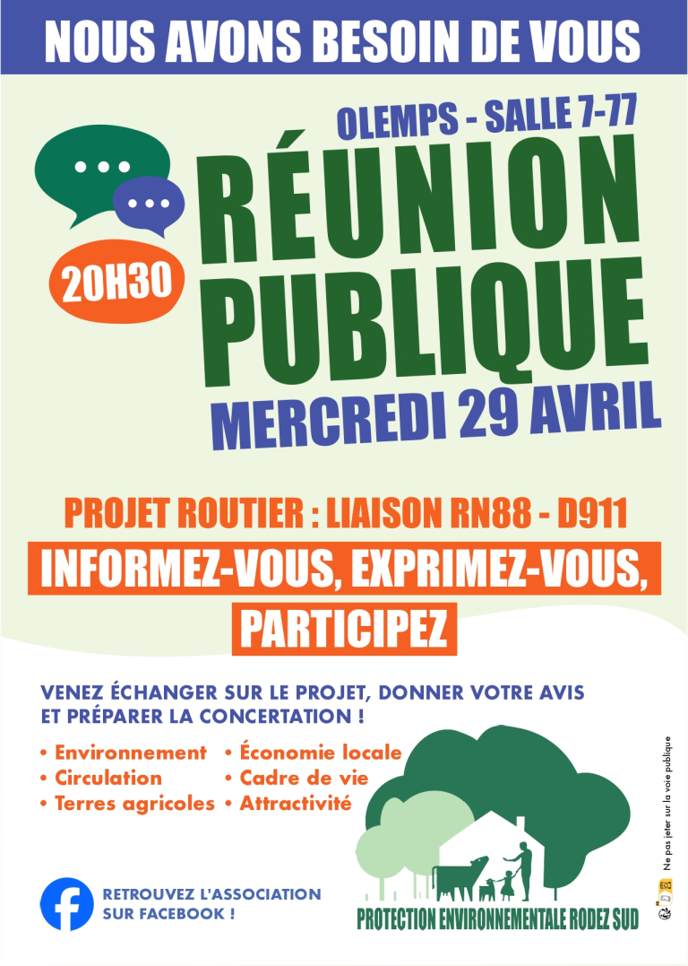 L’association Protection Environnementale Rodez Sud vous propose une réunion publique concernant le projet routier de liaison RN88 – D911.