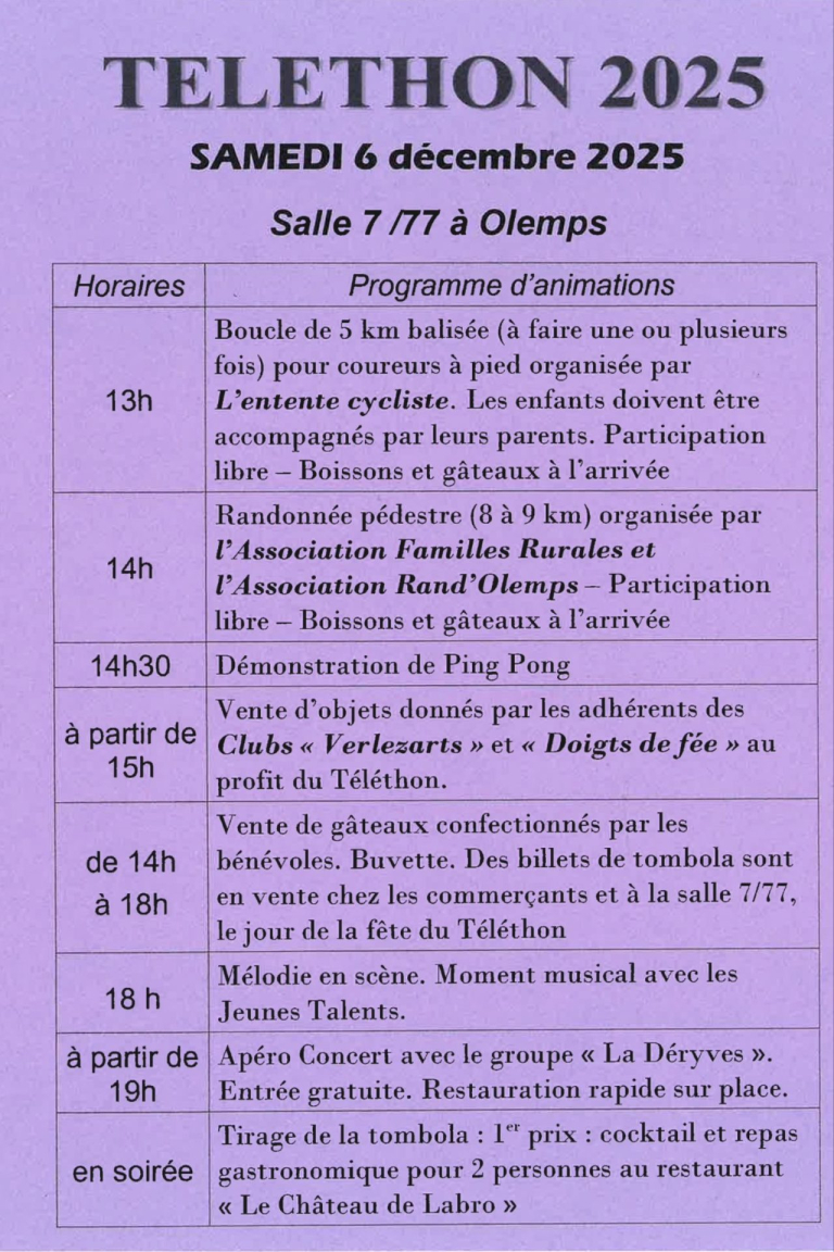 Le samedi 6 décembre 2025 à partir de 13h00, les associations d’Olemps se mobilisent pour le Téléthon. De nombreuses animations vous attendent. Un programme riche pour tous les âges ! Salle 7-77