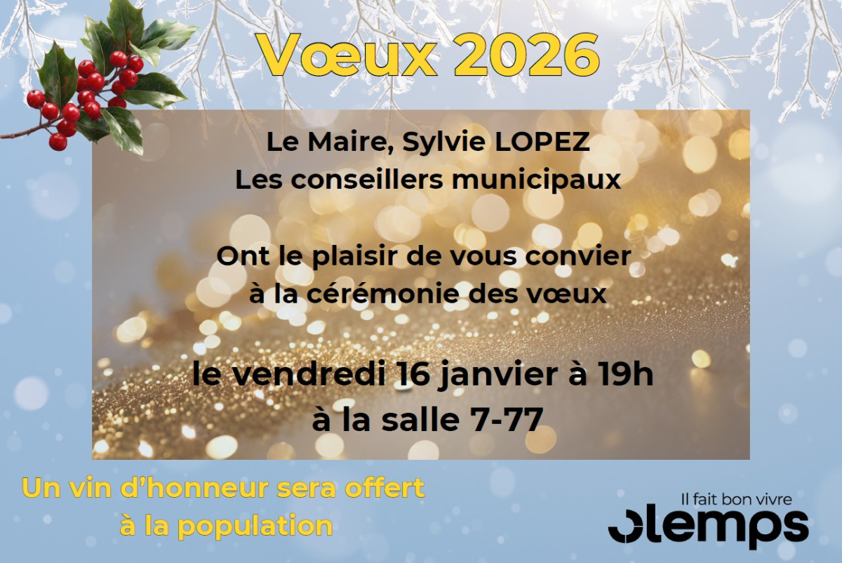 Pour fêter la nouvelle année 2026, Mme le Maire et les élus du Conseil Municipal d’OLEMPS vous invitent à la présentation des Vœux le vendredi 16 janvier à 19h00 à la salle 7-77.